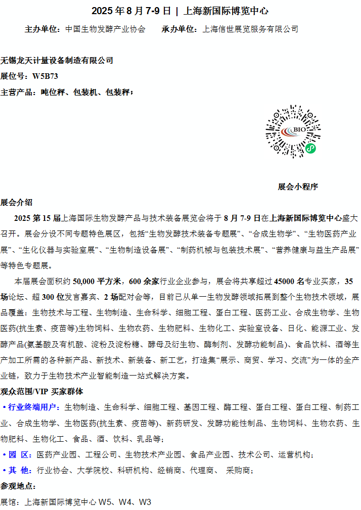 無(wú)錫龍?zhí)煊?jì)量設(shè)備制造有限公司誠(chéng)邀您參觀2025第15屆 上海國(guó)際生物發(fā)酵展